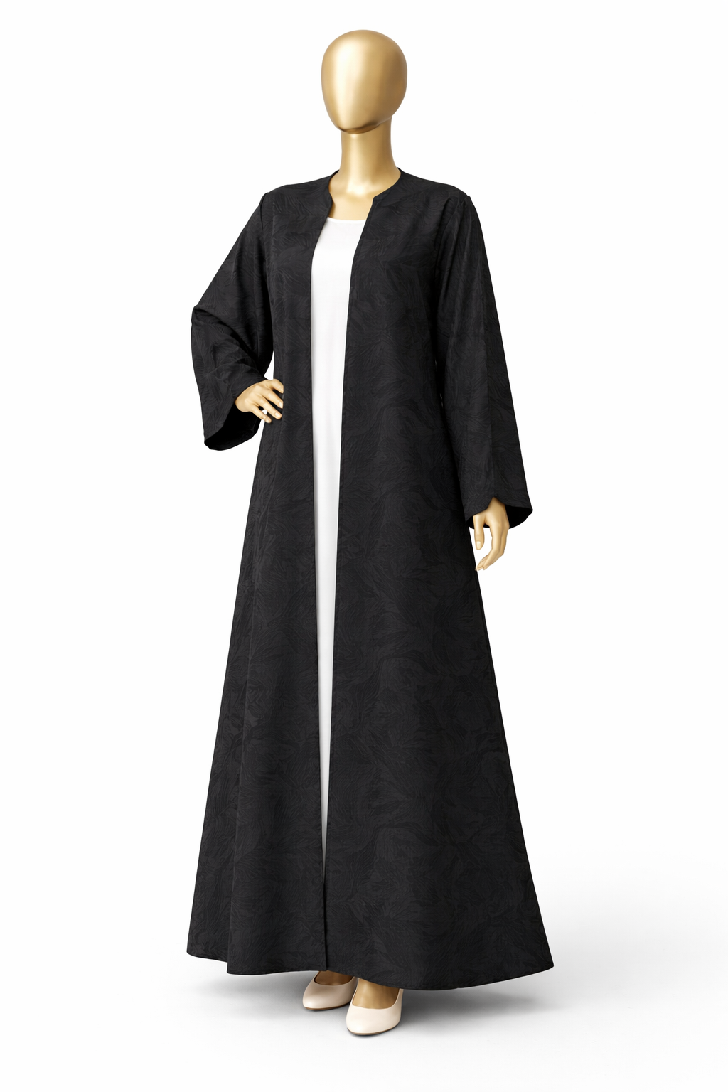 Made with high-quality breathable fabric, this black abaya provides lasting comfort throughout the day. A complementary white under abaya adds depth and provides practicality, ensuring you feel relaxed without compromising style.