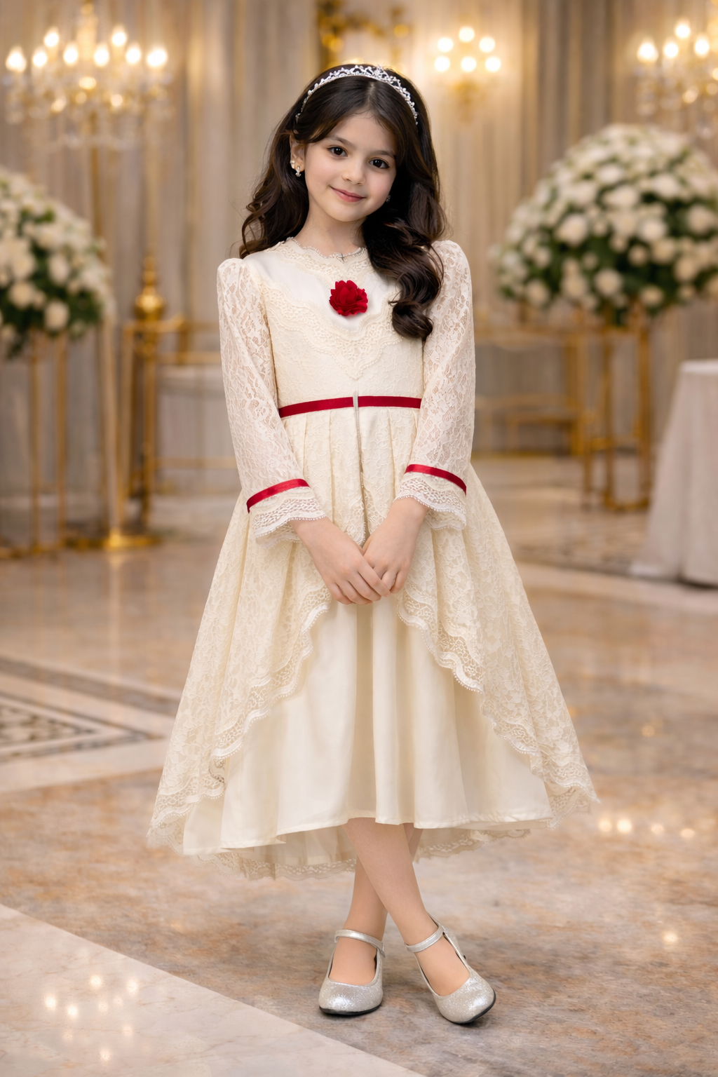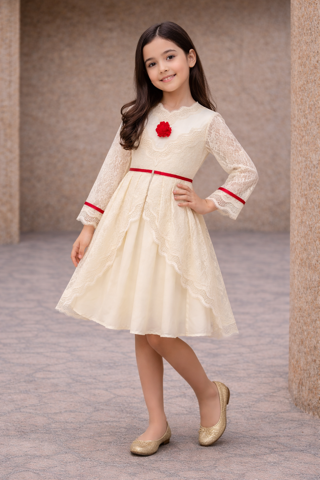 Girls Party Dress With Dantel Lace, Belt & Flower