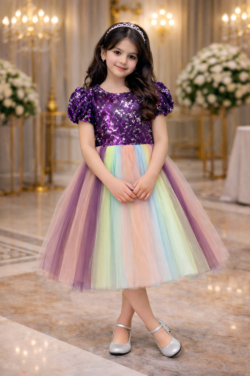 Girls Party Dress With Navy Blue Pearls & Tulle | فستان بنات