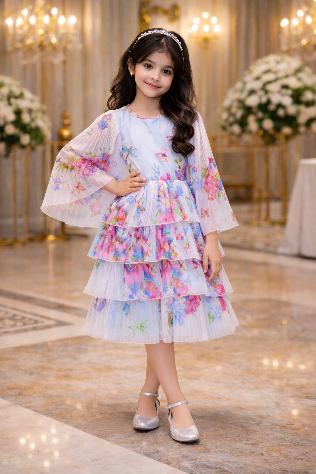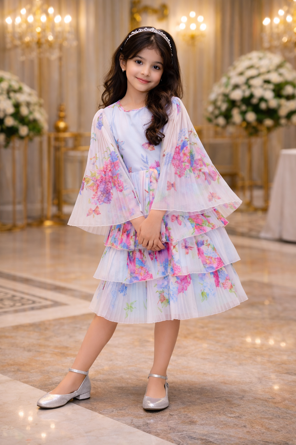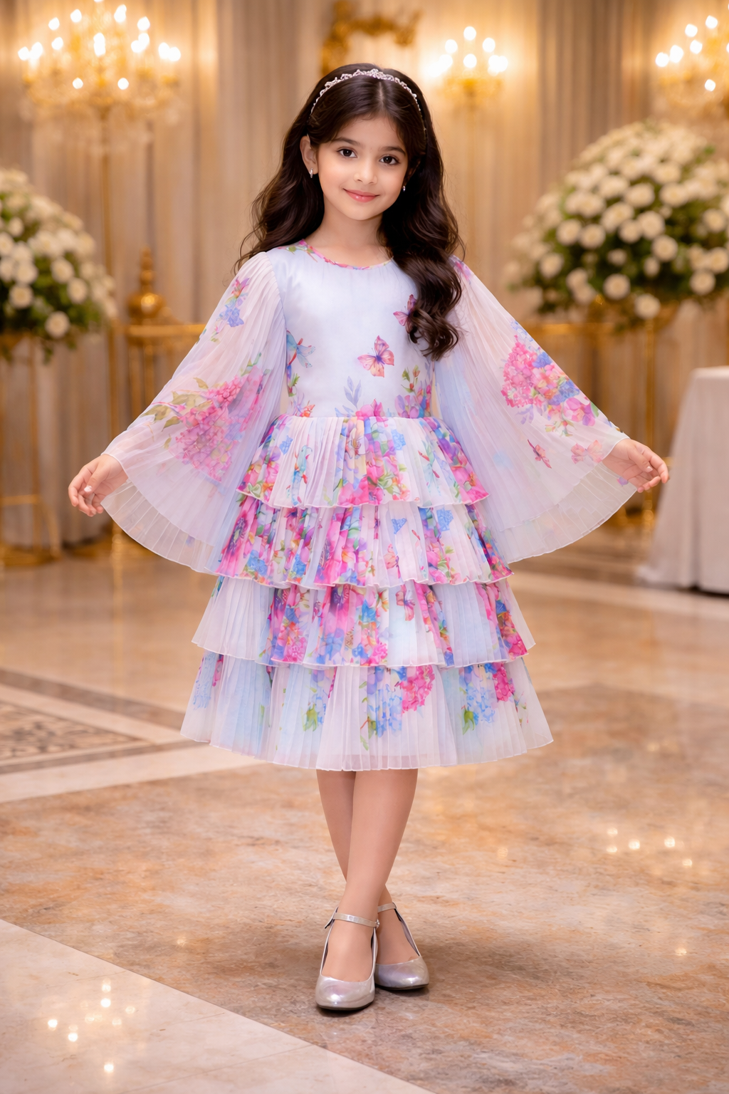 Lamora Tiered Floral & Butterfly Pleated Dress – Whimsical Girls’ Partywear