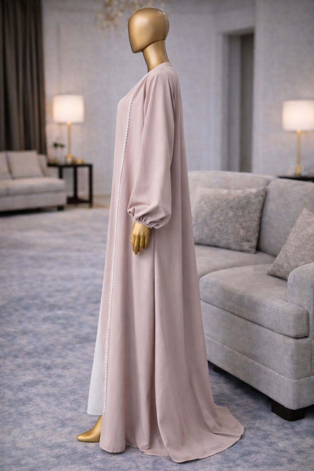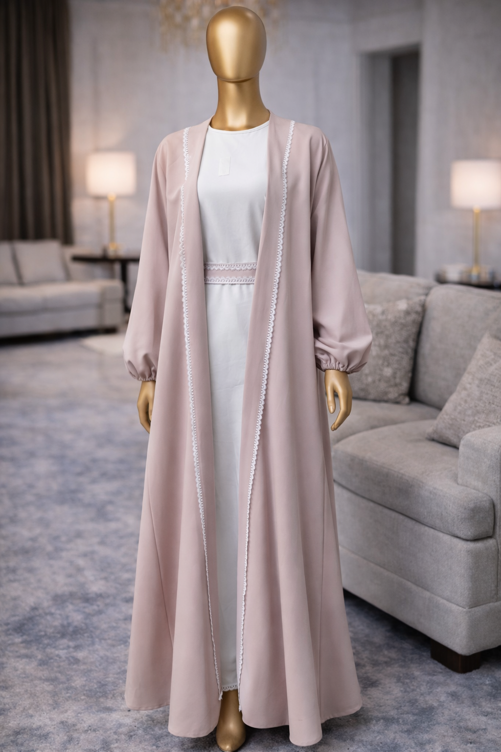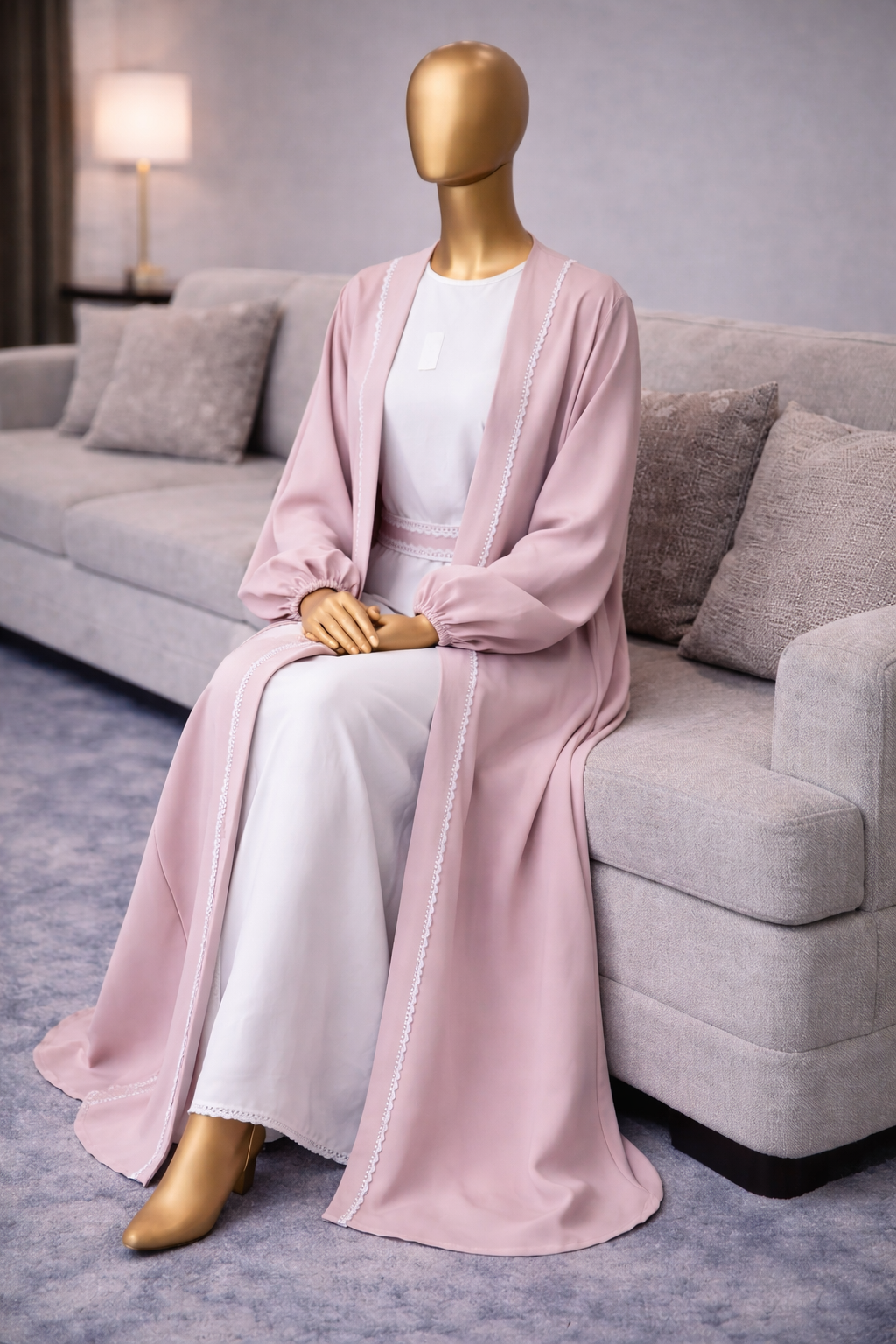 The Hames Alward Abaya offers the perfect blend of style and comfort, crafted with premium Kreb fabric that feels soft and lightweight. Its delicate light pink tone, complemented by a sleek white under Abaya and chic belt, adds a refined touch to your wardrobe.