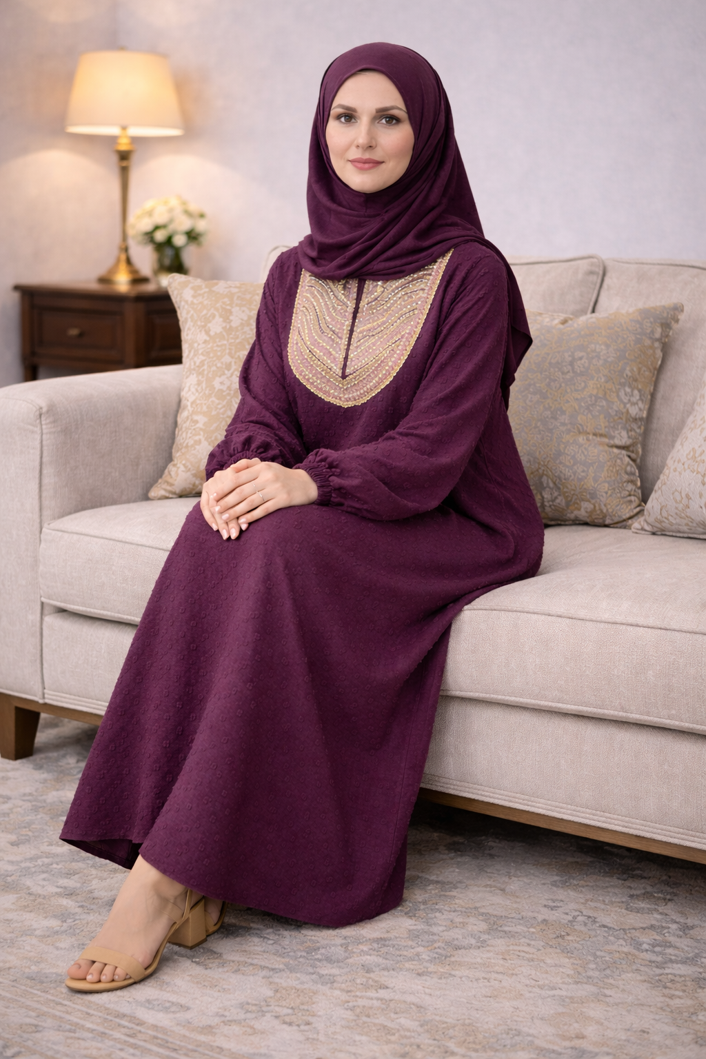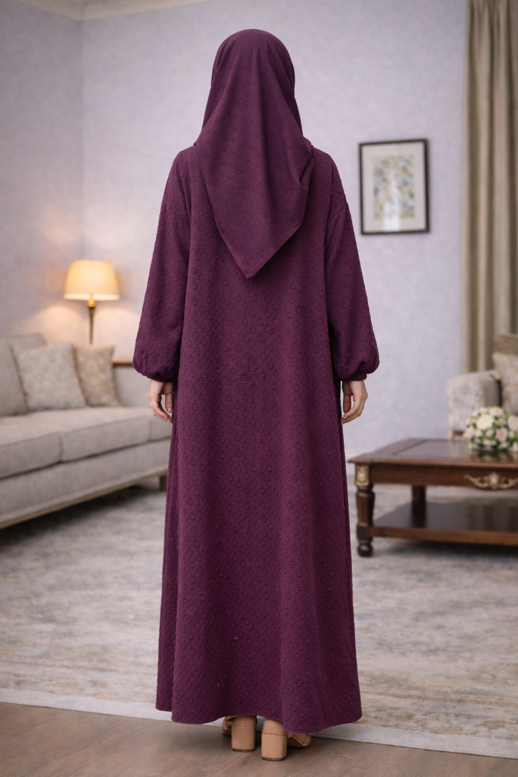 Elevate your daily prayer routine with our beautifully designed prayer dress. Featuring a rich purple color with a delicate pink and golden neckline, this dress combines modesty with an elegant touch, perfectly suited for your spiritual moments.